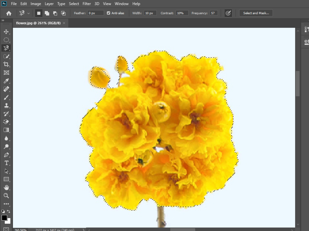 Untuk menggunakan magic wand tool, klik pada bagian dari gambar yang semuanya satu warna (seperti latar belakang putih atau bunga kuning pada contoh dibawah). Magic wand tool akan memilih seluruh area warna itu.